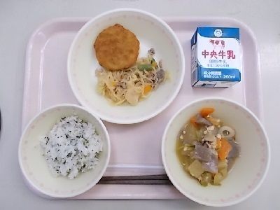 なめし、枝豆コロッケ、切り干し大根の炒め煮、冬瓜のうま煮、牛乳