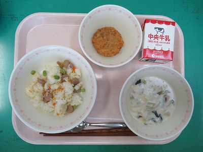 本日の献立:ピラフ・牛乳・れんこんサンドフライ・冬野菜のクリームシチュー