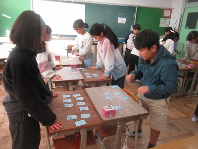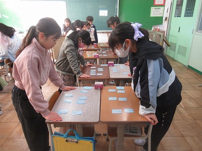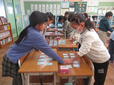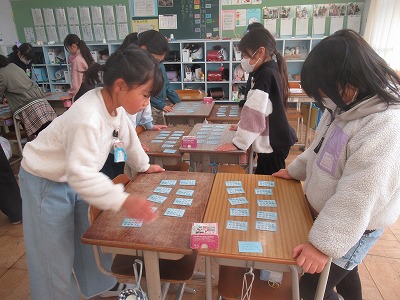 上の句だけで、札を探せる子も多くなっており、上達ぶりにはステキです!対戦の勝ち・負けで、移動することになっており、勝ち進むと『四天王』の座位置につくことができます。みんな頑張っています!!