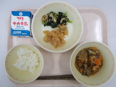 ごはん、サメとレンコンのレモンソース、小松菜の和え物、ご汁、牛乳
