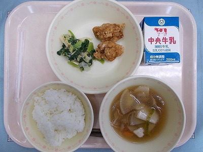 ごはん 牛乳 鶏のから揚げ 小松菜と白菜のツナ和え 吉野汁