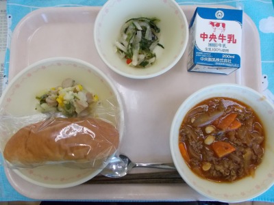 愛知の米粉パン 牛乳 ビーフストロガノフ ジャーマンポテト 水菜と海藻のサラダ
