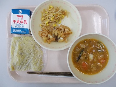 ゴマみそラーメン(中華麺)、ホキとレンコンのレモンソースがけ、大豆もやしとスルメのナムル、牛乳