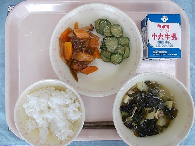 ごはん 牛乳 カラフル酢鶏 きゅうりの香和え わかめスープ