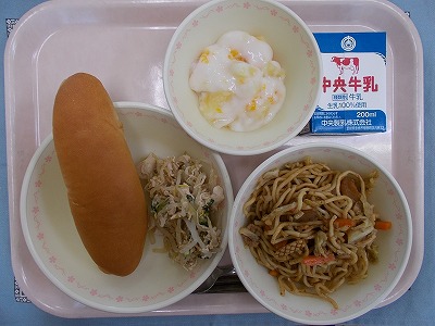 小型ロールパン 牛乳 焼きそば 豆苗とささみのごま酢和え