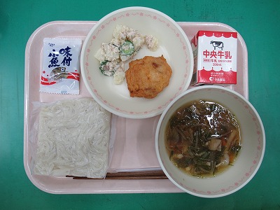 本日の献立:肉うどん(白玉うどん)・牛乳・手作りはんぺん・おかちゃんサラダ・乾燥小魚