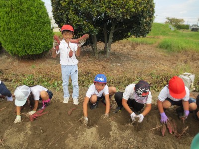 春に苗を植えたさつまいもを1・2年生が堀りました。学校ボランティアの藤松さんがワルナスビの草を抜き、ツルをよけ、マルチをはがして掘りやすくしてくださいました。児童達は、大きなおいもをたくさん掘ることができ、大満足の様子でした。