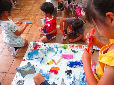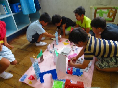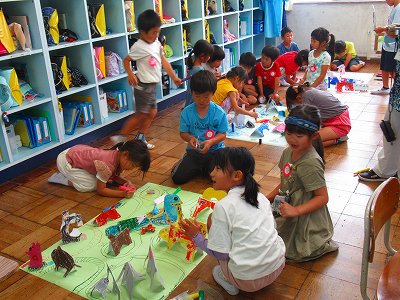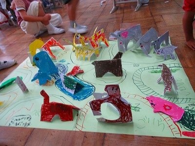 1年生は、図工の時間に「折って立てて」をしました。白い画用紙を折って、動物や乗り物、建物に見立てて、クレヨンで色を塗り、はさみでカットしました。海の生きものや動物園など模造紙の上に様々な世界が出来上がりました。