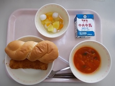 ツイストパン、イカフライのレモン煮、もち麦のトマトスープ、メロンゼリーのポンチ、牛乳