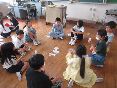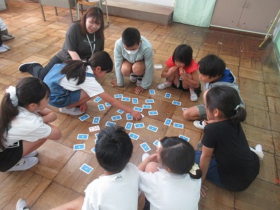 今日は、活動実施回で、各班で決めた遊びをみんなで楽しみました。明け方までの雨で、運動場が使用できなかったので、室内での遊びに切り替えた班もありました。異学年で、一緒に楽しむには、ルールが簡単なこと!また、工夫して楽しめるルールを考えてくれた班もありました。毎回、6年生が中心になって活動を進めてくれています。