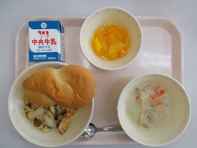 クロスロールパン、ジャーマンポテト、クリームスープ、ミカンゼリーポンチ、牛乳