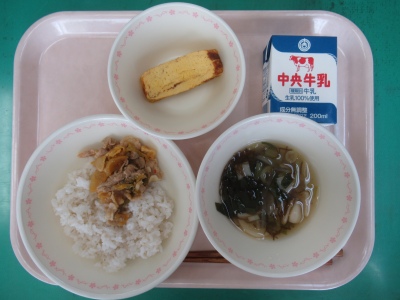 本日の献立:麦ごはん・牛乳・キムタク丼・厚焼き卵・もずく汁