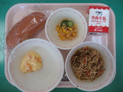 本日の献立:愛知の米粉パン・牛乳・焼きそば・ピリカラサラダ・フルーツカスタード