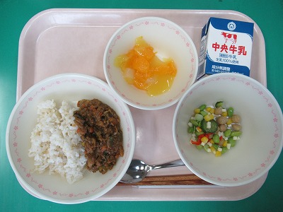 本日の献立:金芽ロウカット玄米ごはん・牛乳・愛西いっぱいキーマカレー・チーズ入りチョップドサラダ・ナタデココとみかんのゼリー