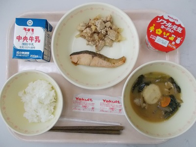 ごはん、サケの香味焼き、煮びたし、粕汁、ヨーグルト、牛乳