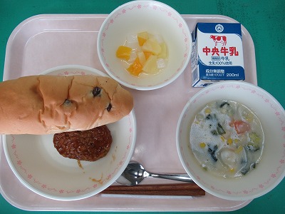 本日の献立:レーズンロールパン・牛乳・デミグラスハンバーグ・冬野菜の豆乳スープ・フルーツカクテル