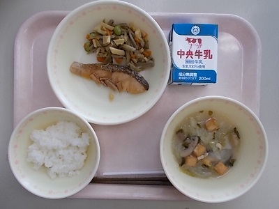 ごはん、サケのキノコあんかけ、きんぴらごぼう、食物繊維たっぷりの白みそ汁、牛乳、