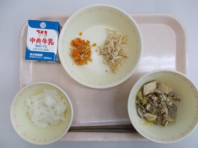 ごはん、にんじんしらすのふりかけ、すき焼き風煮、こんこんサラダ、牛乳