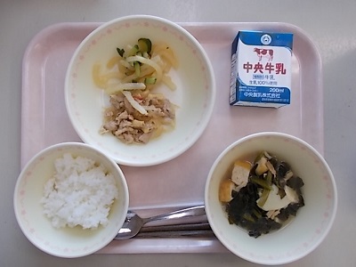 ごはん、チャプチェ、中華あえ、関東風冬瓜スープ、牛乳
