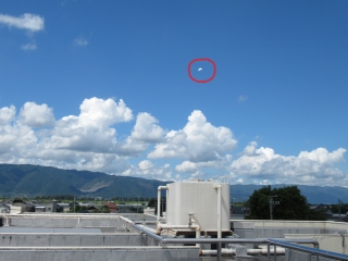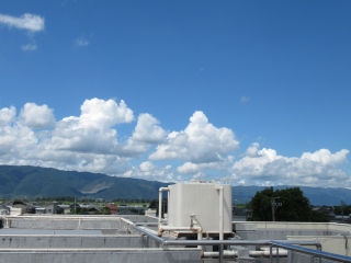 また、「月」の観察についてです。本日は『下弦』で、ちょうど半分になった月が観察できます。「夜ですか?」いいえ、ちがいます。「昼に見える月なんですよ!」といっても、午前中で、昼には西の空に沈んでしまいます。これは、午前中に、学校の屋上から西側の空を撮影した月の写真です。タンクの真上に半分になった月が、弦を下向きにしています。写真では見づらかったので、もう1枚は少し修正を加えて見やすくしました。