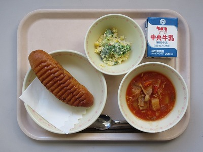 キャラメル揚げパン 牛乳 卵とコーンのミックスサラダ トマタポトフ