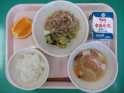 本日の献立 ごはん・牛乳・豚肉のしょうが炒め・うま塩キャベツ・愛西みつばの塩こうじ汁・オレンジ