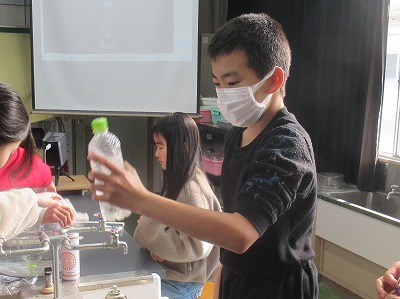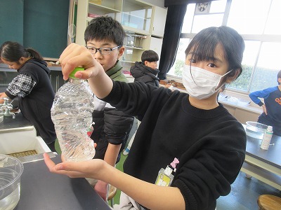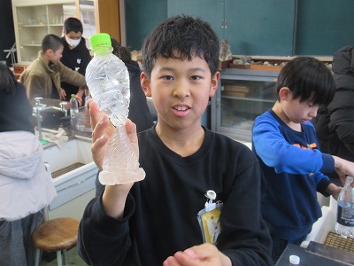 ペットボトルに水と二酸化炭素を入れて振ってみると、みごとにペットボトルがへこみました。水に二酸化炭素が溶けた証拠ですね。日常で、炭酸をつくる家電製品があります。この仕組みであることを知り、理科を身近に感じてくれたようでした。