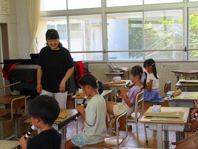 今日から新しい音楽の先生が赴任されました。「はじめまして」のご挨拶として、リコーダーを披露しました。