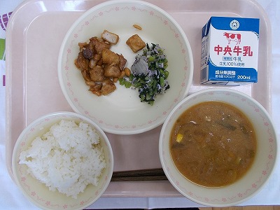 ごはん 牛乳 マグロと大豆の甘辛揚げ ゆかり和え 北海汁