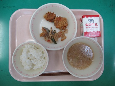本日の献立:ご飯・牛乳・鶏肉のうま塩から揚げ・れんこんきんぴら・ベーコンと野菜のみそ汁