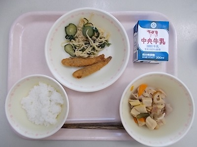 ごはん、高野豆腐の煮物、めひかりのから揚げ、切り干し大根のゴマびたし、牛乳
