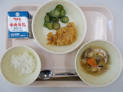ごはん、チーズタッカルビ、キュウリの香り和え、中華スープ、牛乳