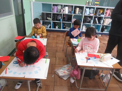 お話にそって、すごろく形式に作成していきます。トンネルや橋など、紙を組み立てたり折って貼りつけたりして、立体的にして工夫もしていきました。自分で考え、楽しく取り組むことができました。