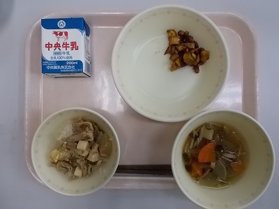 麦ごはん、肉豆腐丼、具だくさん汁、さつまいもと大豆の黒蜜がらめ、牛乳