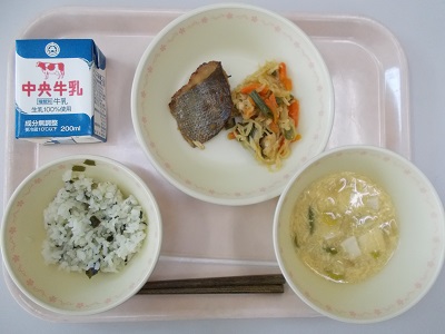 わかめごはん、イサキのみりん醤油漬け、切り干し大根の炒め煮、かきたま汁、牛乳