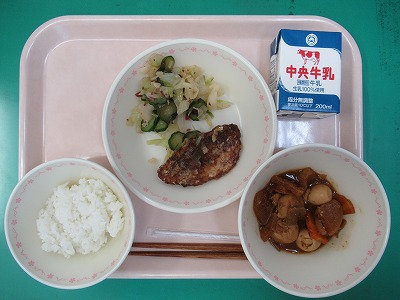 本日の献立:ごはん・牛乳・味噌おでん・トロあじの和風あん・カリカリ梅の彩り和え