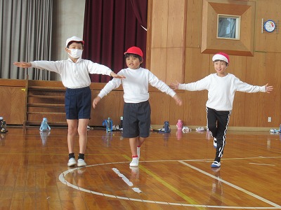 1・2年生合同で、リズムに合わせた表現運動をしました。