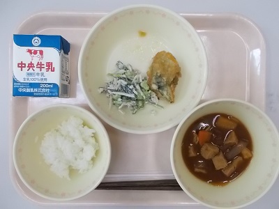 ごはん、サバの南蛮漬け、ファイバーサラダ、さつまいもの味噌汁、牛乳