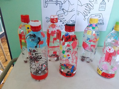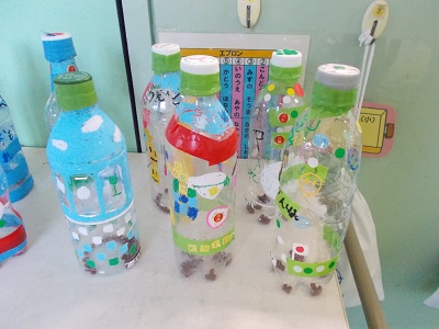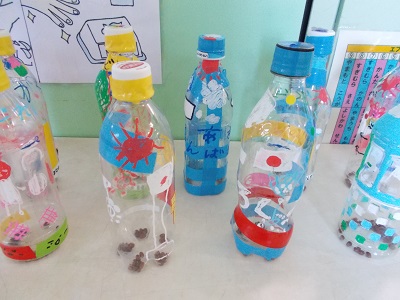 子どもたち一人一人がペットボトルに小豆を入れて、ポスカでイラストを描きマラカスの完成です。