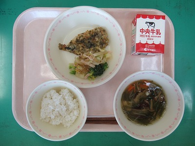 本日の献立:ごはん・牛乳・いわしのお好み揚げ・季節野菜のおひたし・うま味ふんだん汁