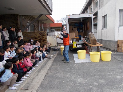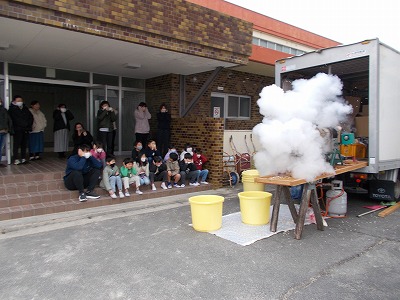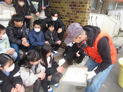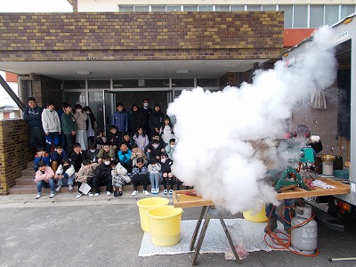 今年も「なつ菓子屋」さんに来ていただき、ポン菓子の見学・試食をさせていただきました。5年生の総合で、お米の発表がありますね。ポン菓子もお米を加工した食品(お菓子)です。どうやって作るのか、と思っていたら、「バンッ!」と大きな音がしました。機械で圧力をかけて熱し、一気に弾けさせて作るのです。出来上がったポン菓子は、元の白米から10倍の大きさになります。質問タイムでは、いろいろと疑問を投げかけ、楽しく・おいしく学ぶことができました。