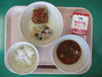 本日の献立:ご飯・牛乳・手作りハンバーグ・干ぴょうサラダ・納豆汁