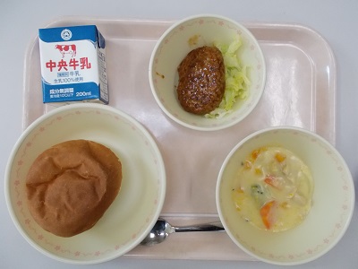 ハンバーガー(サンドイッチバンズパン、デミグラスハンバーグ、ボイルキャベツ)、米粉のクリームシチュー、牛乳