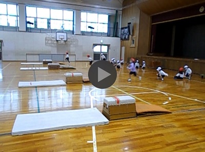 いきなり跳び箱を跳ぶのではなく、跳び箱に乗ったり跳び箱から跳んで降りたりする遊びを通して跳び箱に慣れ親しんでいきます。