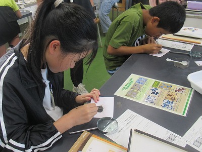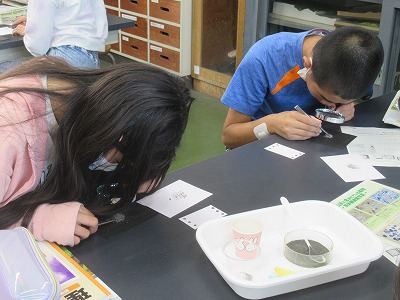 ガラスのように透き通っていたり、キラキラ光っている粒を、鉱物別にすることは難しい作業ですが、宝探しのように楽しんで取り組んでいました。(鉱物については、中学校で詳しく習いますので楽しみにしてください)