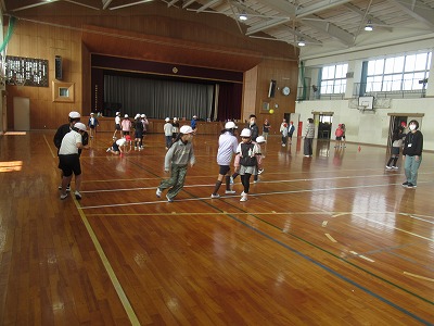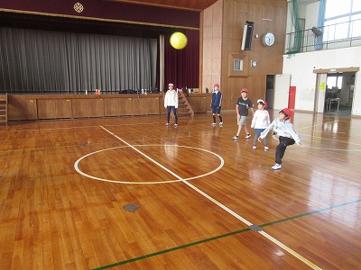 今日は、外では「隠れ鬼ごっこ」「しっぽとり」、体育館では「ラインおに」「ソフトドッジボール」、教室では「風船バレー」をしていました。