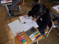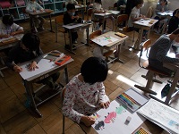 2年生の子どもたちは図工の時間に冬休みの思い出を絵で表現していました。
