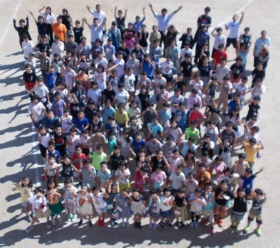 全校児童・教職員の笑顔があふれる写真撮影となりました。完成が楽しみです。