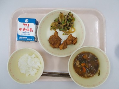ごはん、手羽先風から揚げ、あいさいみつばの和え物、津島ふ入り味噌汁、牛乳