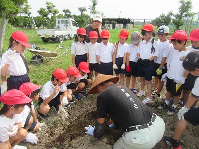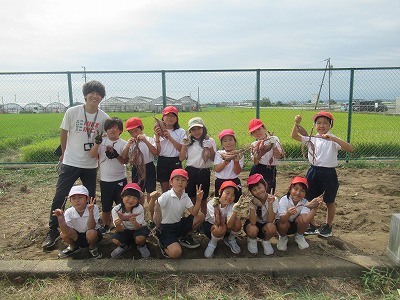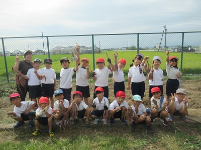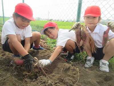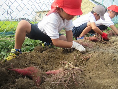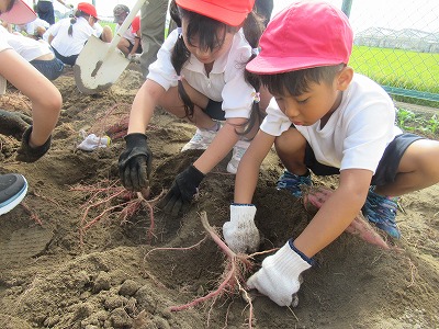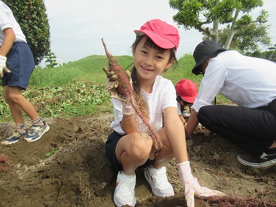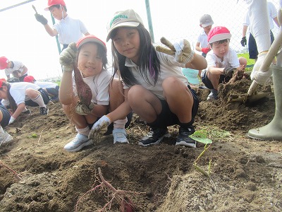 手で土をかき分けて、いもを探しました。一生懸命にいもを探す姿があり、見つけた時の笑顔があふれていました。最後には、両手に収穫したいもを持って集合写真を撮りました。これまで、学校ボランティアの方が世話をしてくれていました。感謝の気持ちも伝えることができました。